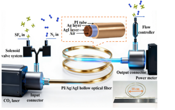 该项目历时两年,创新性地采用自研聚酰亚胺(polyimide,PI)空芯光纤作为气室与光传输通道,结合CO₂激光光源与信号探测系统,成功构建出一种超快高灵敏度的六氟化硫(Sulfur hexafluoride,SF₆)气体传感器研究方案。项目由敬承斌教授、褚君浩院士、刘侃老师共同指导,祝润苗同学任负责人,陈翘楚、张至立、徐凤乾、谢海洋、但林虹、夏天睿、彭思祺等同学共同完成。